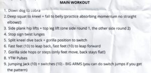 | Hydrate before coffee Head to shoulder Reach Ups YTW Calf raises Sit to stand Janice's sequence | World's greatest stretch Sit to stand Forward arm swing Calf raises Big side lunge & twist Flick hands Single leg spelling | Water, RestoraLAX | Jalbum website |